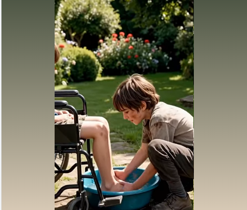 At the edge of the stone path, a disabled boy sat in a wheelchair. His legs rested inside a shallow plastic basin filled with water that reflected the sky.