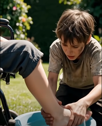 At the center, a disabled boy sat in a wheelchair, his legs lowered into a small plastic basin of water. The surface reflected the sky, calm and innocent.