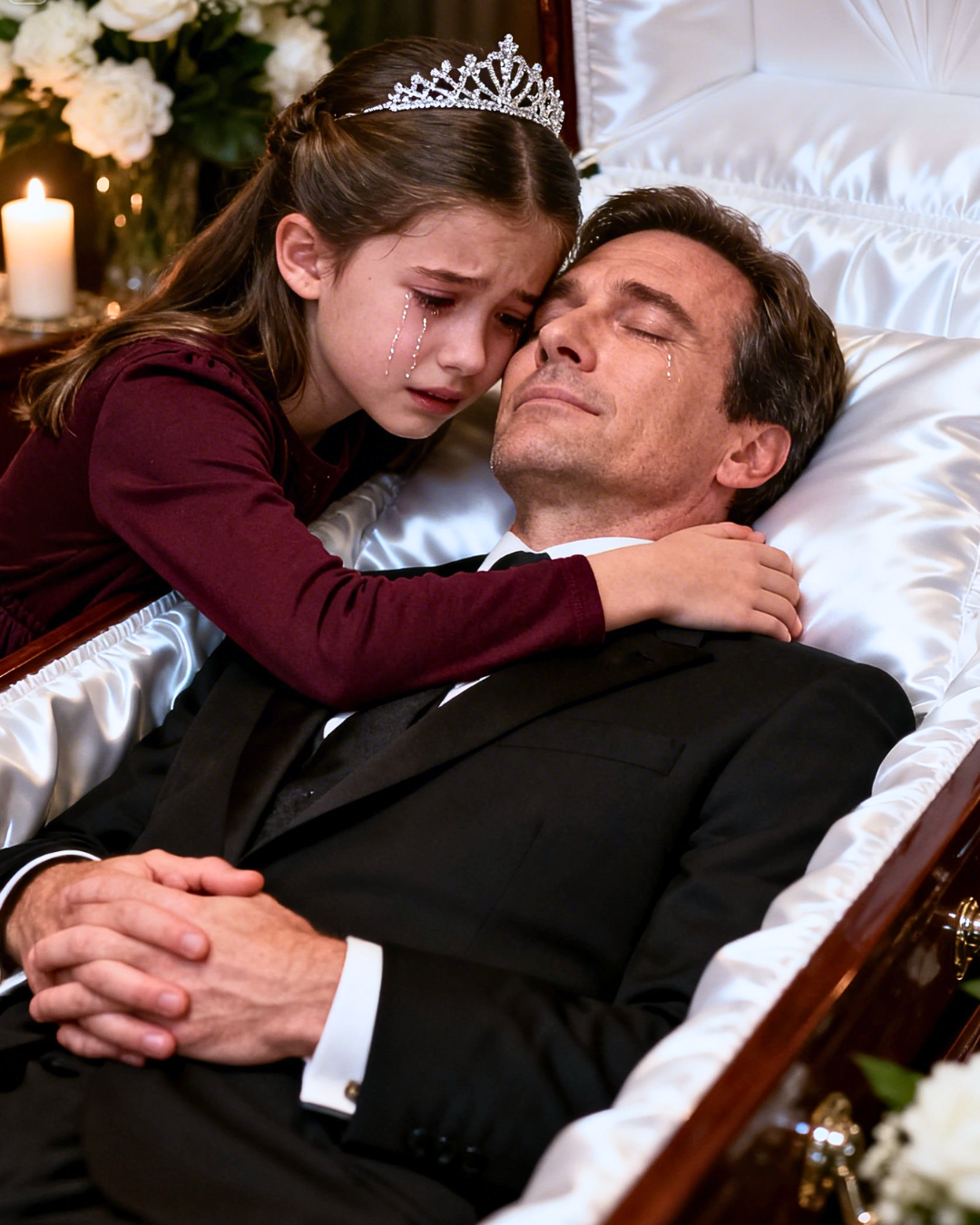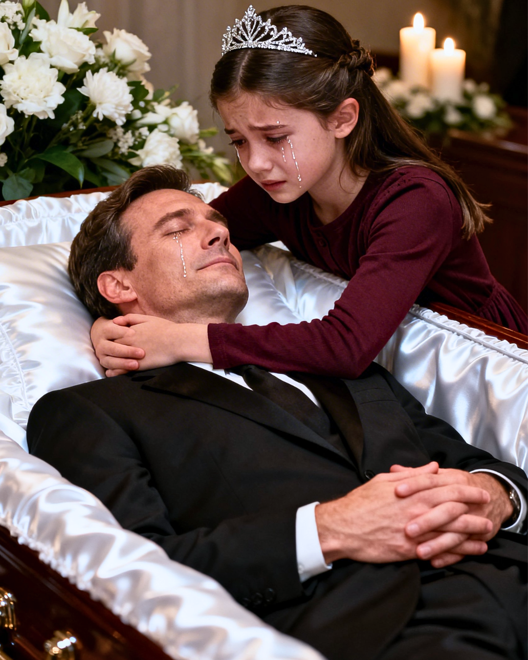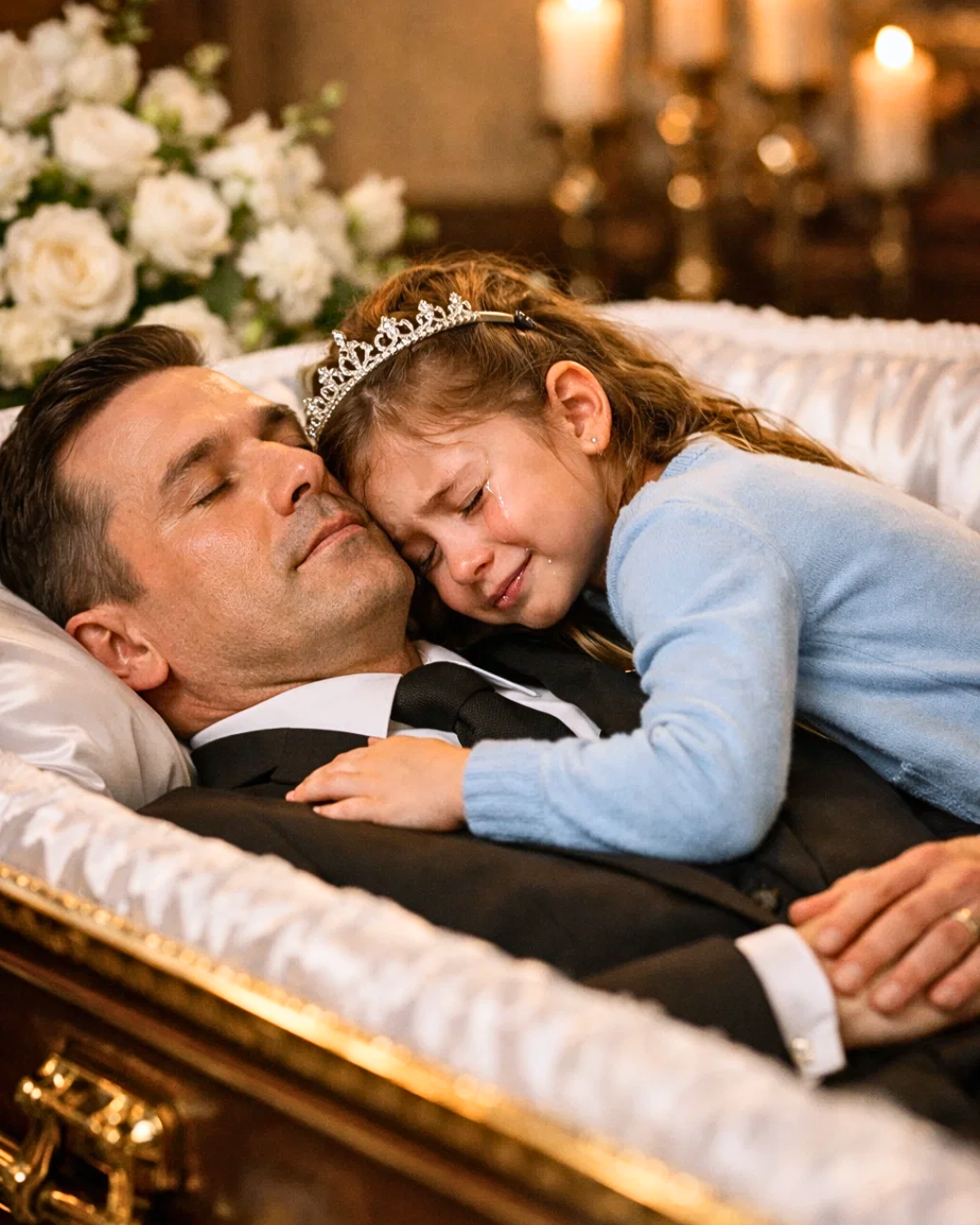 You crouch beside the coffin, and your voice shakes as you speak to your daughter like you’re negotiating with fate.