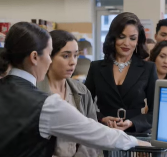 The rich woman behind the conveyor slowly turned and realized too late who had walked in.