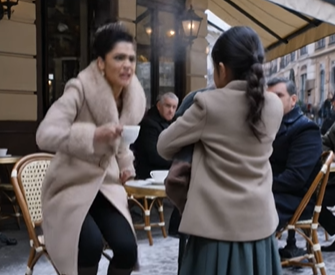 She pointed at the rich elegant woman.