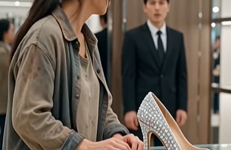The wealthy owner slowly walks toward the frightened woman. The employee starts apologizing nervously. “Sir, she was touching the diamond shoes…” The owner