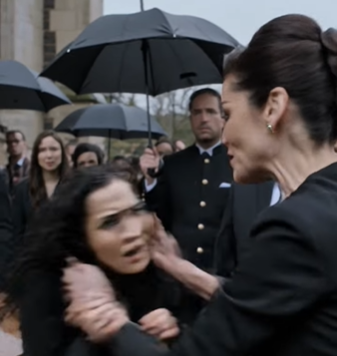 Mourners gasped. Umbrellas turned. Phones rose from the back as the poor woman nearly fell against the coffin, breathless, humiliated, struggling to stay on her feet.
