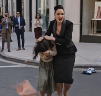 Outside the designer boutique, shopping bags dropped, heels froze, and phones flew up from every direction as the rich elegant woman grabbed the poor young woman by the hair and dragged her across the pavement.