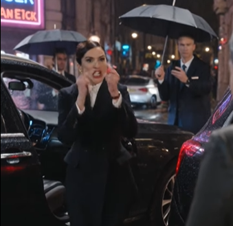 Not even the elegant woman standing in the rain beside the car.