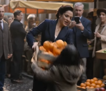 The oranges lay scattered across the wet ground, the shoppers stood frozen with their bags in hand, and the little girl remained on her knees, clutching the faded ribbon like it was the only thing holding her together.