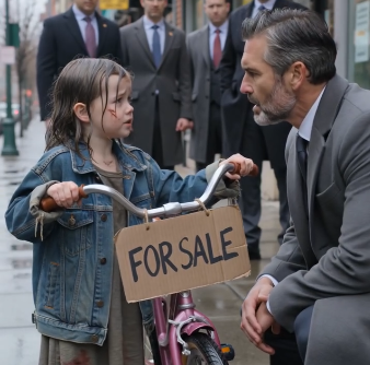Most adults either walked away or paid quickly just to escape the sadness. But this man kept looking at the bike, then at the men, then back at her with the expression of someone no longer hearing a sad story — someone seeing a pattern.