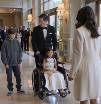 The future wife stood angled toward the exit, already half gone in her mind. The father remained one step away from the wheelchair, caught between his daughter and the woman he had nearly trusted with the rest of his life. The boy on the left stayed silent now, because the paper had done what his voice only started.