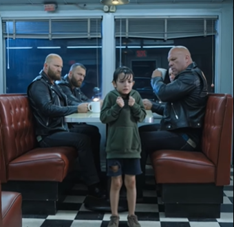 The scarred biker stepped between the child and the door.