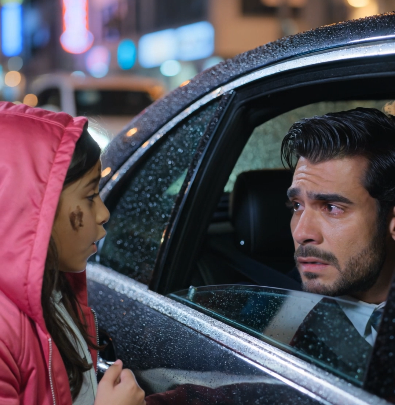 Abrió la puerta del coche de golpe y salió bajo la lluvia.