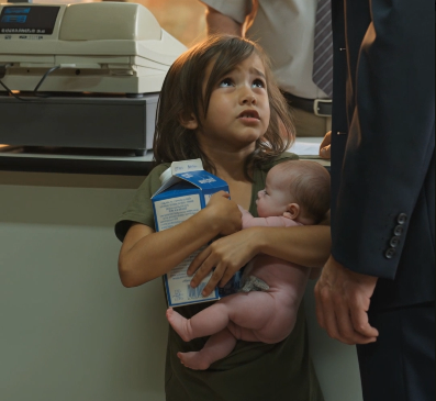The clerk pointed at the child in the girl’s arms.