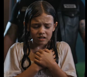 Outside, the little girl saw the bikers emerge through the rain.