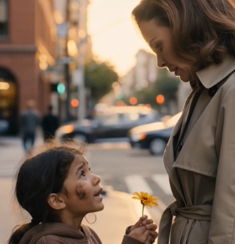 The woman grabbed the child’s shoulders gently, eyes filling with tears.