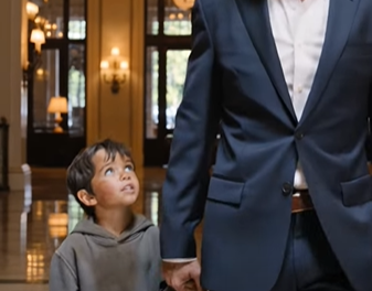 The man stood slowly and guided the child toward a quiet corner near the grand staircase, away from the reception desk and the guests pretending not to stare.