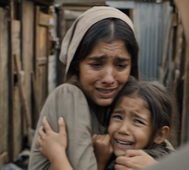 La femme serre les deux enfants contre elle.