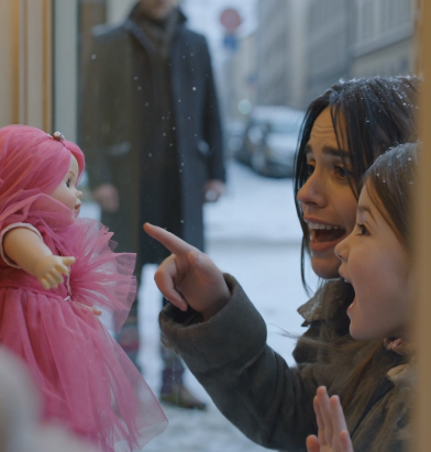 La petite fille regarde l’un, puis l’autre, perdue, la neige fondant sur ses cils.